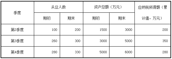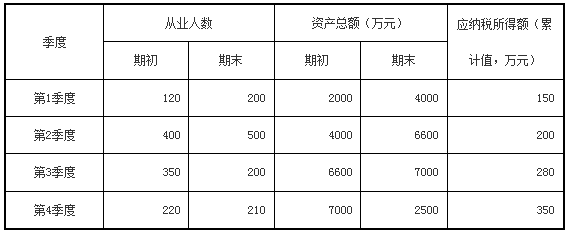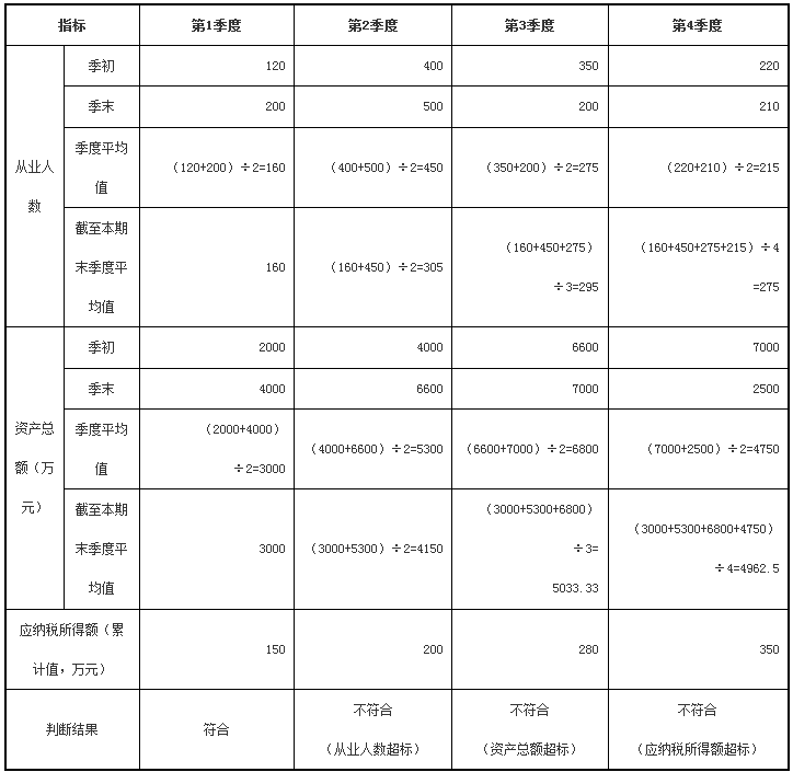 例1.A企业2017年成立,从事国家非限制和禁止行业,2019年各季度的资产总额、从业人数以及累计应纳税所得额情况如下表所示: