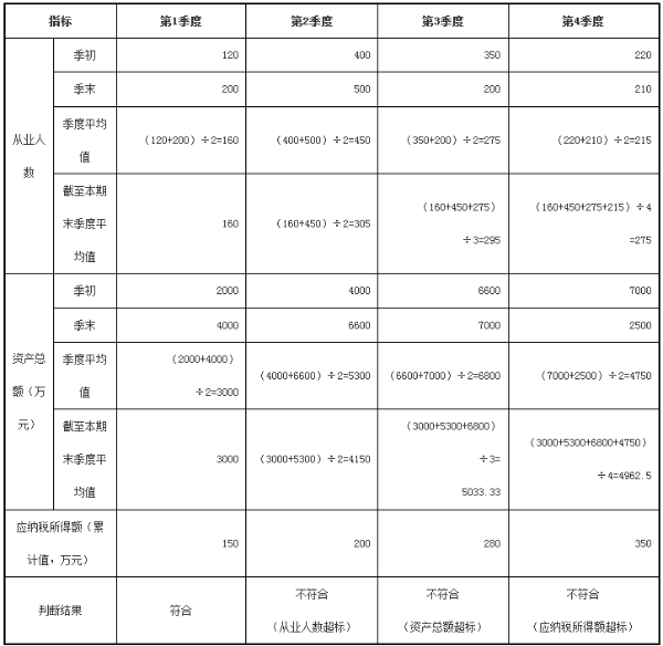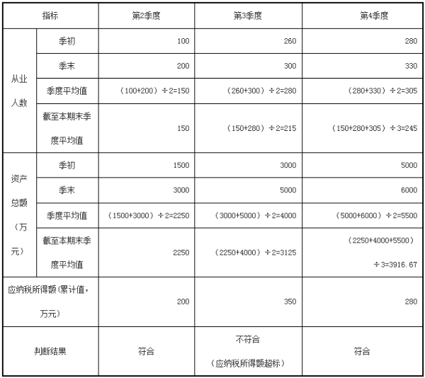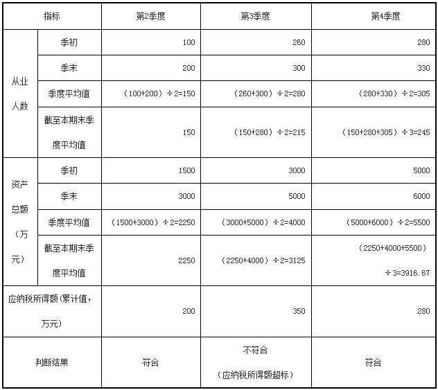 具体判断方法为:资产总额、从业人数指标比照《通知》第二条规定中“全年季度平均值”的计算公式,计算截至本期末的季度平均值;年应纳税所得额指标按截至本期末不超过300万元的标准判断。示例如下: