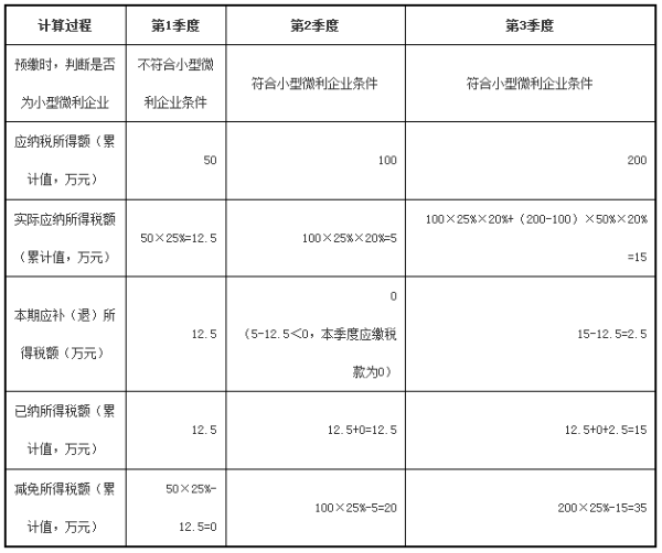 例3.C企业2019年第1季度预缴企业所得税时,经过判断不符合小型微利企业条件,但是此后的第2季度和第3季度预缴企业所得税时,经过判断符合小型微利企业条件。第1季度至第3季度预缴企业所得税时,相应的累计应纳税所得额分别为50万元、100万元、200万元。