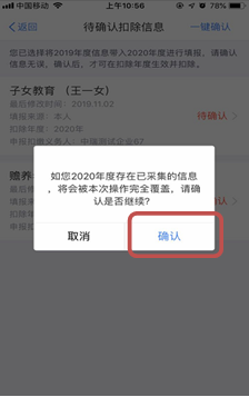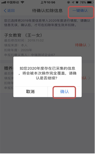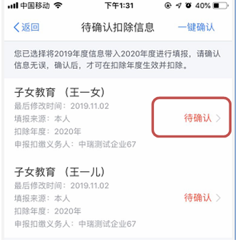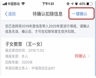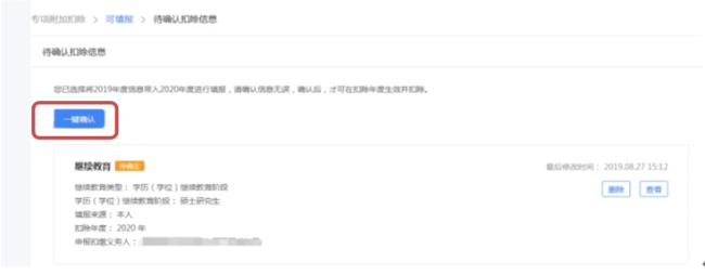 (3)点击“确认”,页面跳转至“待确认扣除信息”页面。如果您的信息没有任何变化,可直接点击“一键确认”,完成操作。