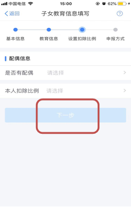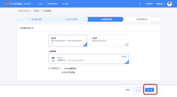 (5)选择是否有配偶和扣除比例,点击“下一步”。若之前未添加过配偶信息选择“有配偶”后可以在该页面先添加配偶信息。
