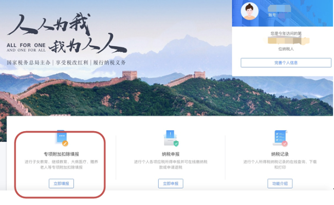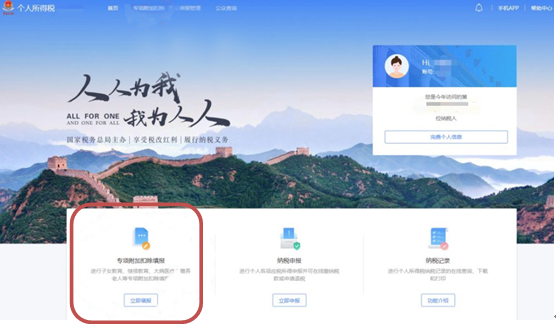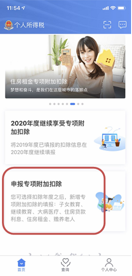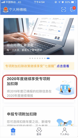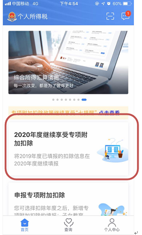 (1)首页点击“2020年度继续享受专项附加扣除”。