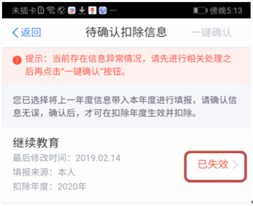 在将2019年填报的专项附加扣除信息带入2020年时,如个别扣除项目之前填报有效期是截至2019年度内的,那么这条记录将显示为“已失效”。此时需关注并修改该条记录在2020年的有效期。如该项扣除在2020年已不符合享受条件,纳税人删除即可。