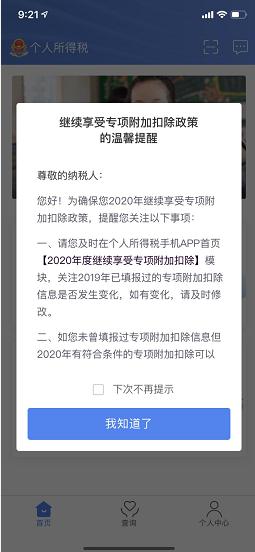 登录成功后,首页弹窗介绍“继续享受专项附加扣除政策的温馨提醒”以及继续享受“七提醒”。