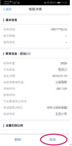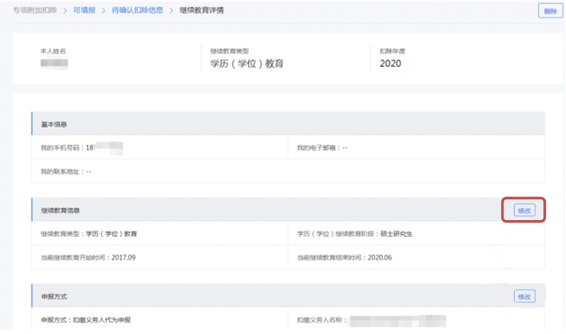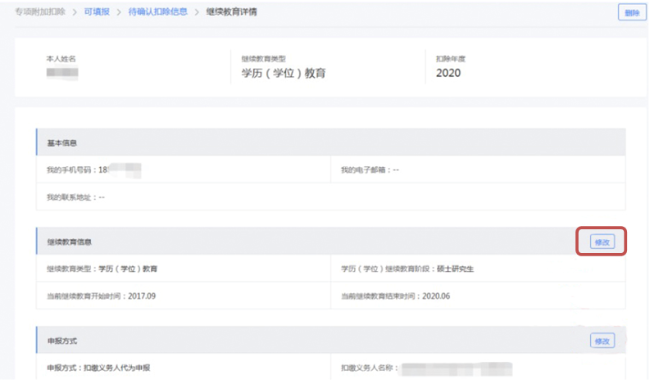 (4)进入相应扣除项目的填报详情页。如需修改,点击该页最下方“修改”键,可进行相关内容修改,点击“确认修改”后完成修改。若需删除,直接点击“删除”。