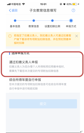 (4)根据实际情况选择“通过扣缴义务人申报”或“综合所得年度自行申报”方式,点击“提交”。