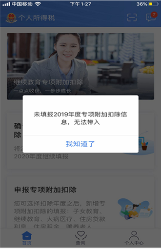 (2)2019年未填报过专项附加扣除信息,但点击了“2020年度继续享受专项附加扣除”键后,系统将提示:“未填报2019年度专项附加扣除信息,无法带入”。此时,需要您自行填报2020年度的专项附加扣除信息。