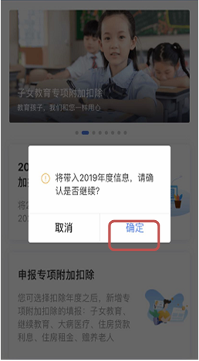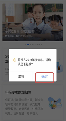(2)系统提示:“将带入2019年度信息,请确认是否继续?”点击“确定”。