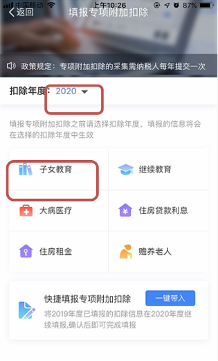(1)首页导航栏选择“专项附加扣除”,在“可填报”页面选择“扣除年度”为2020。在“快捷填报”栏目点击“一键带入”。