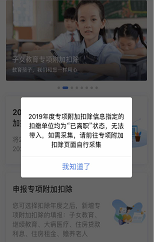 (3)若您在2019年底办理了离职手续,您之前填报的专项附加扣除状态将显示为“已离职”。点击“一键确认”时,系统将提示“2019年度专项附加扣除信息指定的扣缴单位均为‘已离职’状态,无法带入,如需采集,请前往专项附加扣除页面自行采集”。