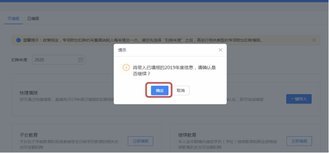(2)根据系统提示:“将带入已填报的2019年度信息,请确认是否继续?”
