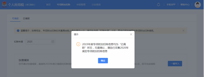 (3)如2019年底办理了离职手续,您之前填报的专项附加扣除信息状态将显示为“已离职”。点击“一键确认”时,系统将提示“2019年度专项附加扣除信息均为‘已离职’状态,无需确认,请自行采集2020年度的专项附加扣除信息”。
