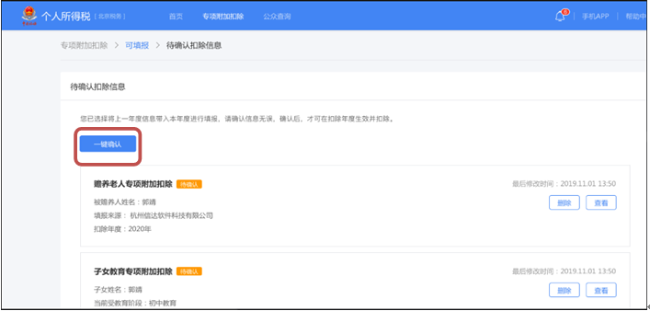 (6)在“待确认扣除信息”页面,点击“一键确认”完成操作。