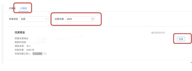 (2)点击“已填报”,选择扣除年度“2020”,再点击“查看”进入修改界面。