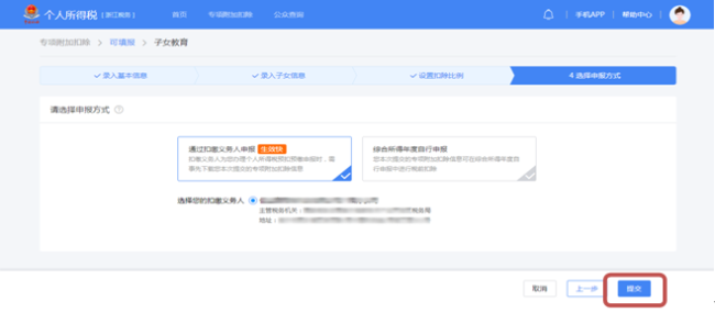 (6)选择申报方式,“提交”即可完成2020年专项附加扣除申报。如需在扣缴单位办理扣除的,请选择【通过扣缴义务人申报】。