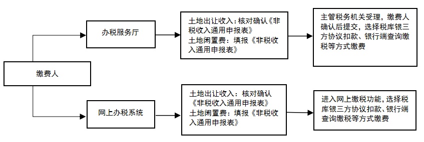 缴费人依据《征缴土地闲置费决定书》规定的金额和付款期限,通过网上办税系统或办税服务厅向主管税务机关提交《非税收入通用申报表》,完成土地闲置费申报缴费。