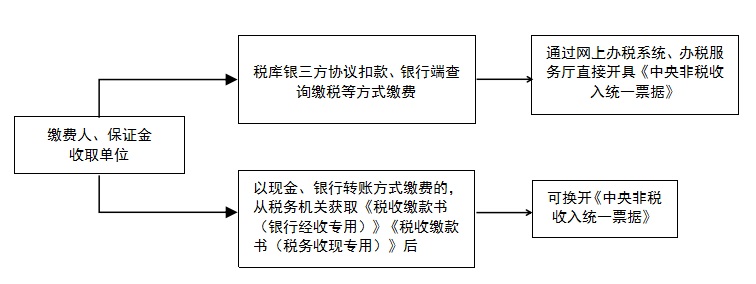 缴费人、保证金收取单位申报缴费后,可通过网上办税系统或办税服务厅开具《中央非税收入统一票据》。缴费人以现金、银行转账方式缴费的,从税务机关获取《税收缴款书(银行经收专用)》《税收缴款书(税务收现专用)》后,税务机关可为其换开《中央非税收入统一票据》。