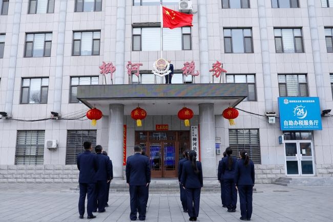 图为国家税务总局黑龙江省税务局举行升国旗仪式(陆洋 王钊 摄)